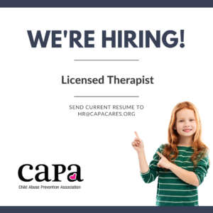 CAPA Therapists provide individual, family, and group counseling services for families who have experienced trauma. Counseling services are provided in the CAPA office, virtually and/or... Read more: We’re Hiring!